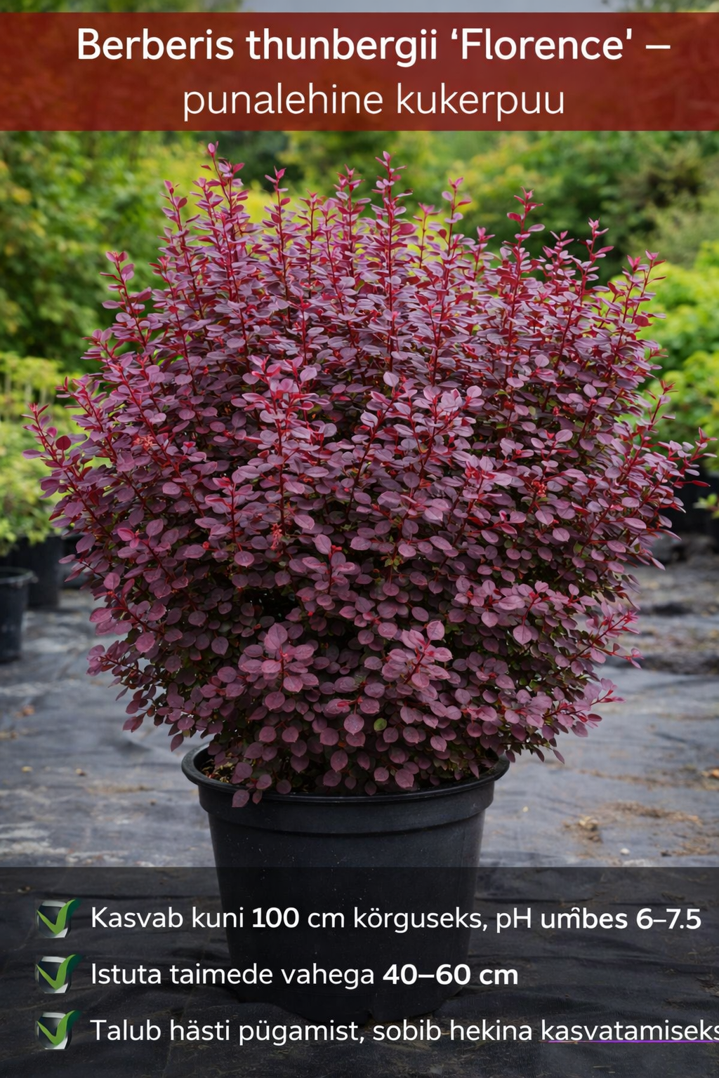 Berberis thunbergii ‘Florence’ on dekoratiivne punalehine kukerpuu, mis sobib hästi hekkideks, istutusalade ääristamiseks ja kiviktaimlatesse. Kompaktne ja tihe kasvukuju muudab selle väga heaks valikuks nii väiksematesse kui suurematesse aedadesse. Taim on vastupidav ja sobib hästi Eesti kliimasse.